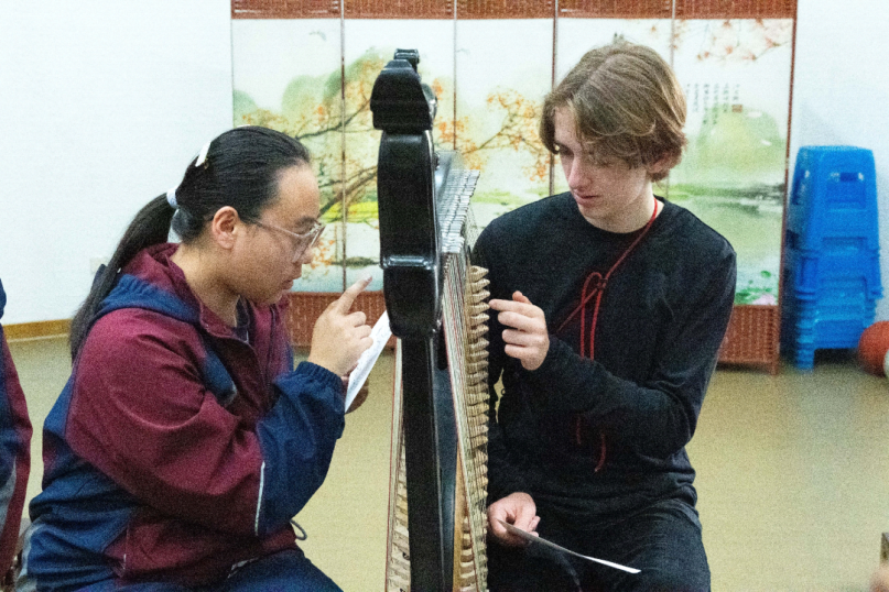 在鄞州中学民乐教室,德国学生换上飘逸的汉服,或坐在古筝、箜篌前轻轻拨弦,或拿起鼓槌敲起中国鼓。不少学生由衷感叹:“身着汉服弹奏古筝,仿佛时光都变得舒缓悠长。”